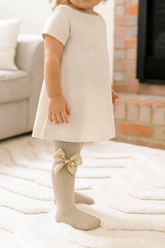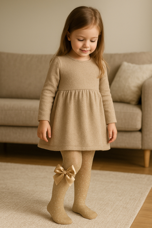 De Cóndor Maillot Lurex / Glitter met Satijnen Strik Beige / Goud (313) is dé musthave voor kleine fashionista’s die houden van stijl, comfort en een vleugje glamour. 🌸
